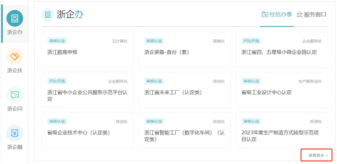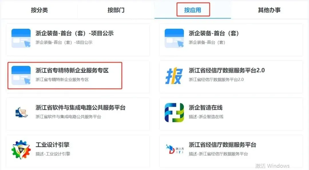 企业登录浙江省企业之家网(https://zj87.jxt.zj.gov.cn/),通过点击左侧【浙企办】-【查看更多】-【按应用】-【浙江省专精特新企业服务专区】