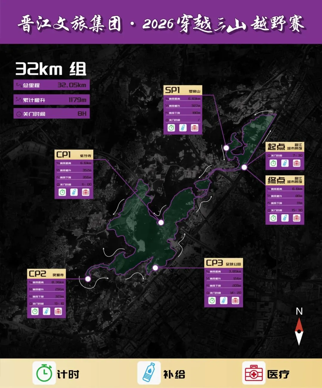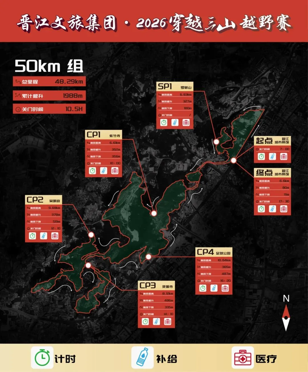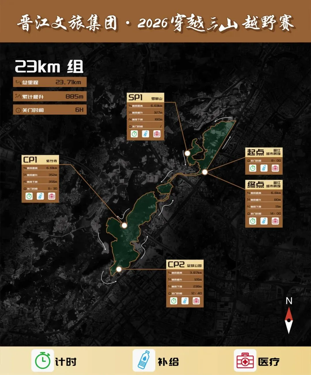 赛道说明:从CP3出发沿着自行车道两公里经过灵源派出所后面来到高速公路上方再次左转进入树林里沿着小路八百米出来后进入草庵公园,沿着水库行进经过龙泉书院门口后来到草庵寺门口,这里也是往返重合赛道,注意观察。经过龙泉小学后左转沿着自行车道来到晋光路,过往车辆较多,服从现场交警指挥,过了晋光路,也来到晋江市医院罗裳院区后面,沿着水泥路依次经过舜帝庙、金玛国宾酒店,也将迎来本次比赛的终点胜利曙光就在眼前。