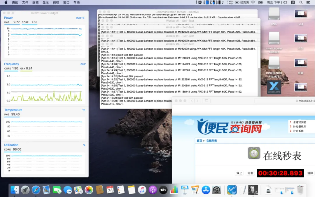 由于MacOS的兼容性问题,我们使用P95 Small FFTs进行压力测试。