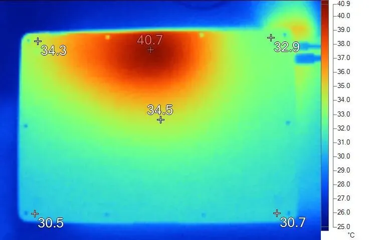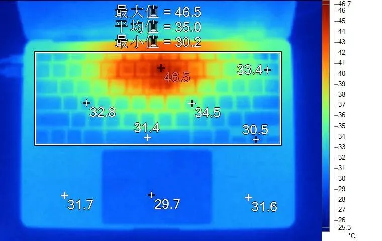 表面温度如上图所示,键盘键帽温度最高为46.5℃,WASD键位区域在33℃附近。背面最高温度40.7℃。