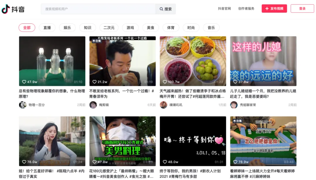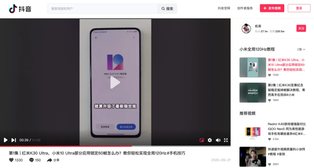 机哥简单总结一下哈,抖音网页版就是在传统视频网站的框架上,导入了手机抖音App的视频。