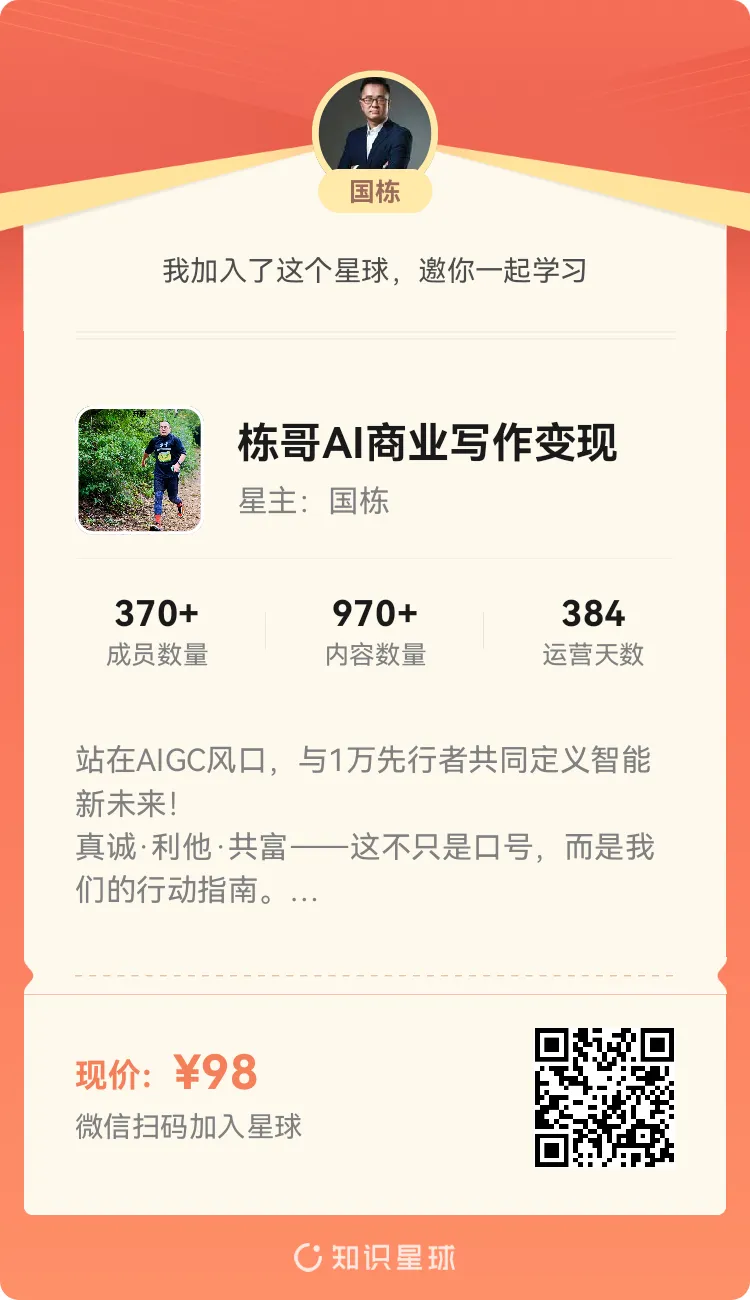 如果你也想在 AI 浪潮中通过文案写作拿到结果,欢迎加入我的【知识星球】,那里有我更深度的实战案例分享。
