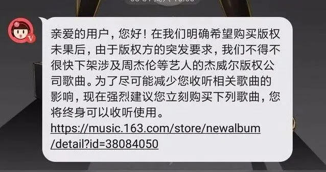由于版权方的突发要求,我们不得不很快下架设计周杰伦等艺人的杰威尔版权公司歌曲。为了尽可能减少您收听相关歌曲的影响,现在强烈建议您立刻购买下列歌曲,您将终身可以收听使用。