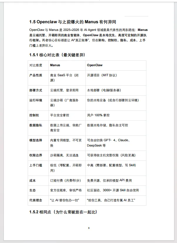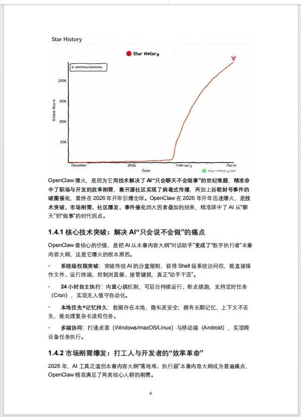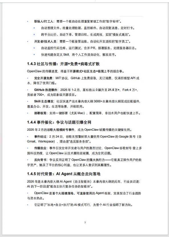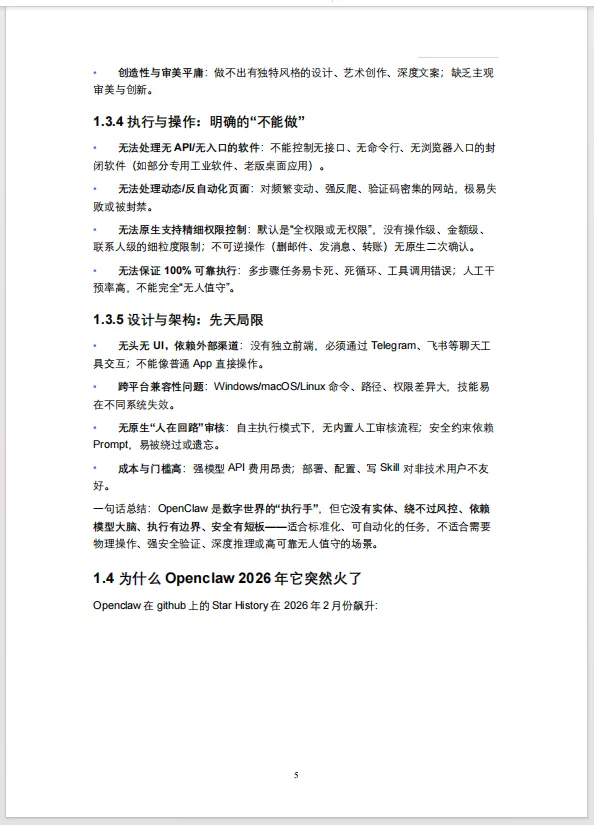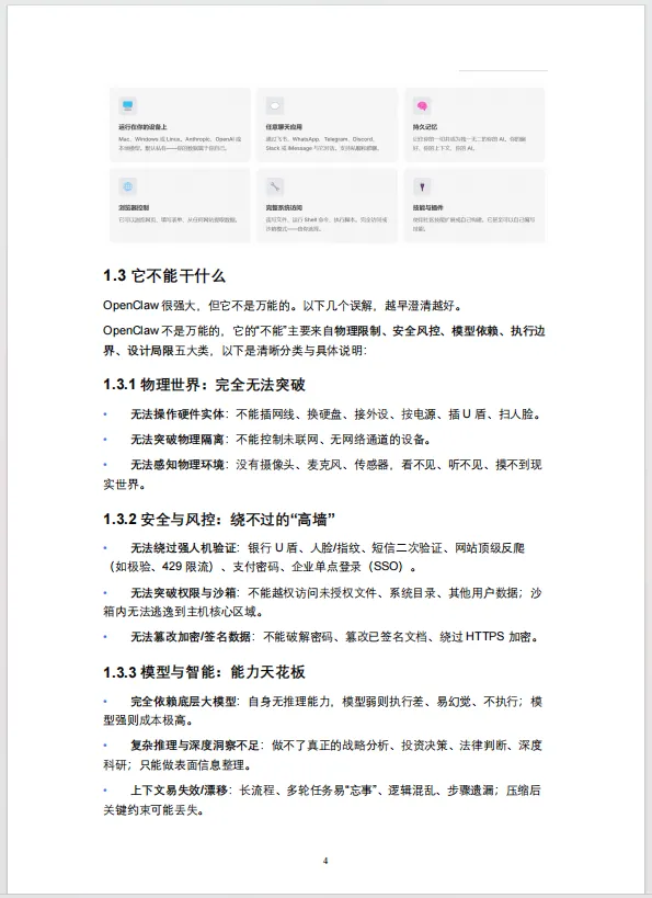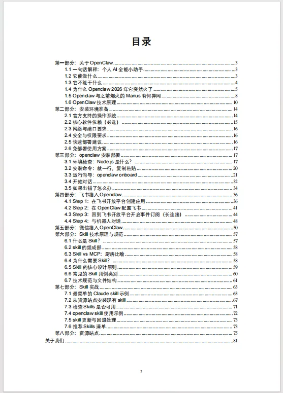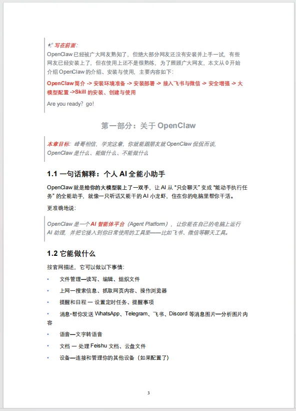 这《2026年OpenClaw新手入门宝典》81页系统性地将OpenClaw这一前沿AI智能体平台从概念到实践进行了全面拆解与本土化适配,为中文用户群体提供了从零到精通的完整路径。它不仅降低了技术门槛,使非专业开发者也能部署和使用强大的AI执行助手,更通过详尽的场景化教程(如飞书、微信接入)和原理剖析(如Skill机制),将开源项目的技术优势转化为可落地的生产力工具。指南精准捕捉了2026年AI从“对话”迈向“执行”的时代拐点,回应了市场对自动化与效率的刚性需求。其内容兼具深度与广度,既涵盖安装部署、环境配置等实操细节,也深入探讨了架构设计、安全风控与生态扩展,形成了从“会用”到“懂原理”再到“能定制”的完整知识闭环。尤为关键的是,指南结合中国本土生态(如MiniMax、飞书、企业微信)给出了具体配置方案,并提供了容器化部署等免运维选择,解决了海外项目在国内落地的常见痛点。它不仅是操作手册,更是生态连接的桥梁,通过整合官方文档、社区资源与第三方服务,为用户构建了一个可持续学习和进阶的支持体系。这份指南的发布,加速了OpenClaw在国内的普及与应用创新,赋能个体与组织利用AI智能体实现工作流的自动化变革,是推动AI技术民主化与实用化进程中的重要推动力。