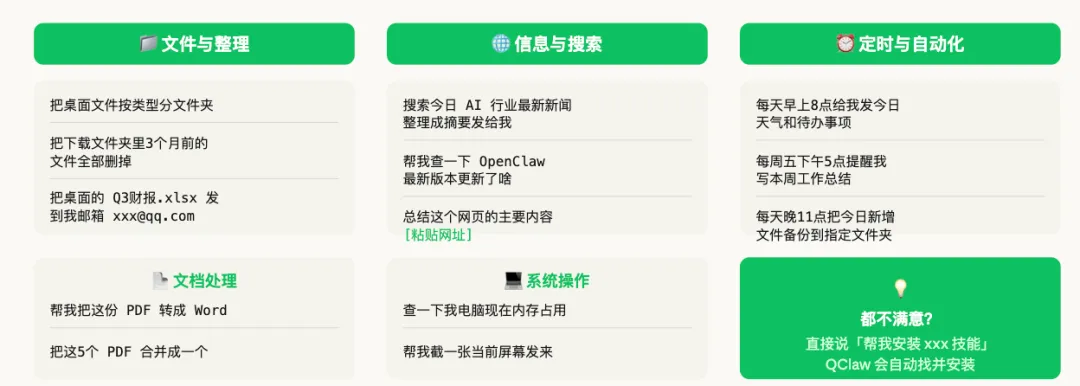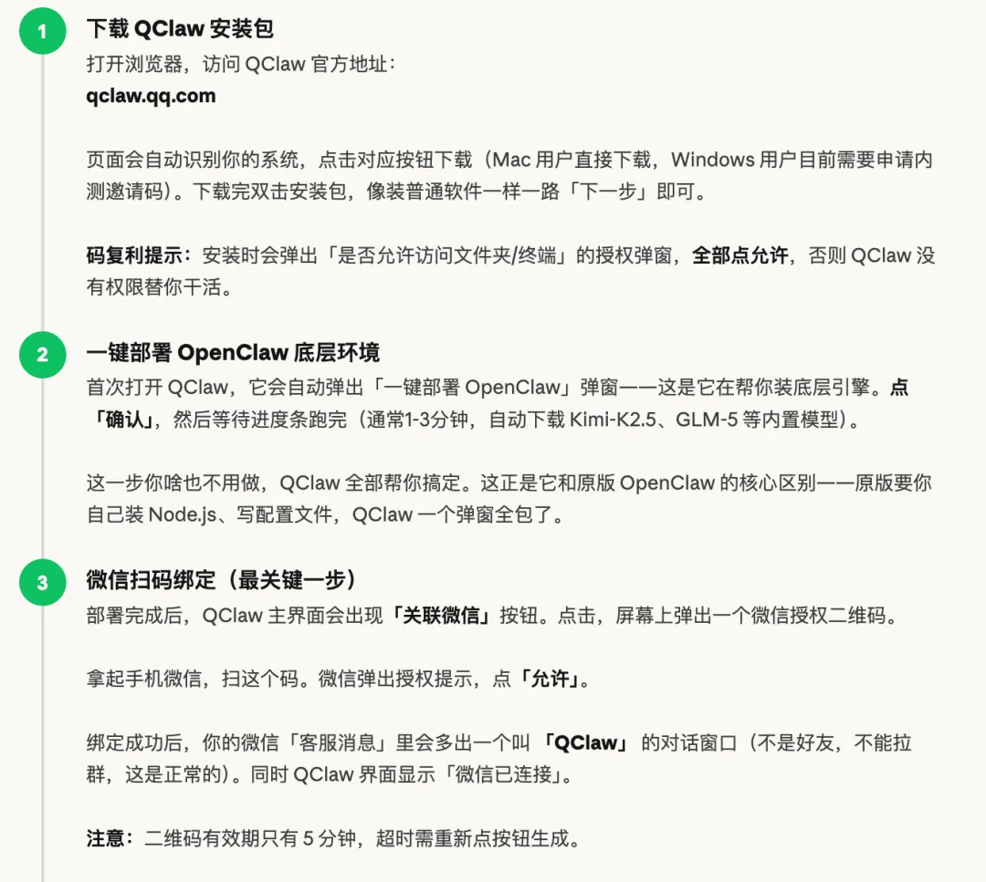 QClaw 是腾讯电脑管家团队做的国内封装版,把最难的那层全包了——无需配置环境、内置国产模型(Kimi-K2.5、GLM-5 等)、一键安装、微信直连。你只要会用微信,就能用 QClaw。