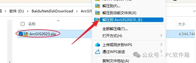 1.鼠标右击下载的【ArcGIS 2023】压缩包,选择解压到【ArcGIS 2023】。