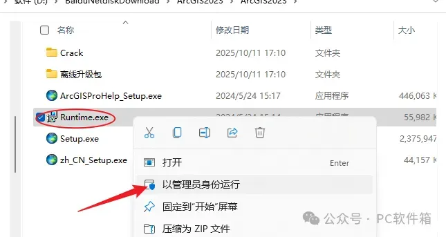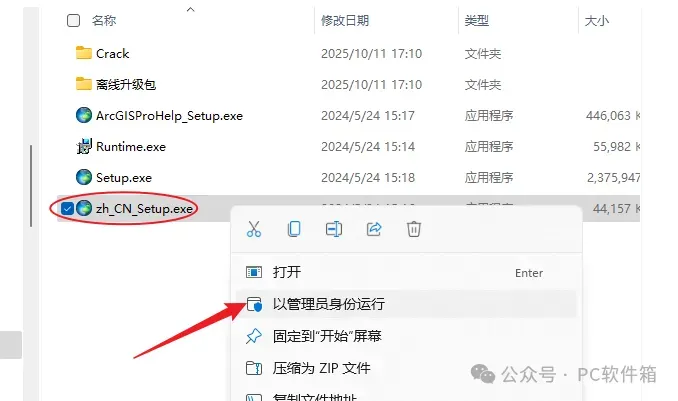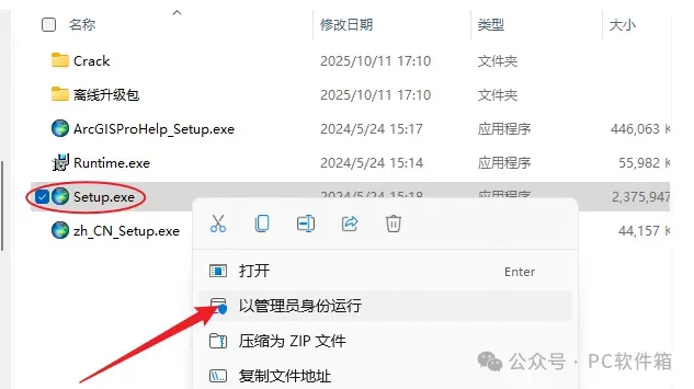 6.回到解压后的安装包【ArcGIS2023】文件夹,鼠标右击【Setup】选择【以管理员身份运行】。
