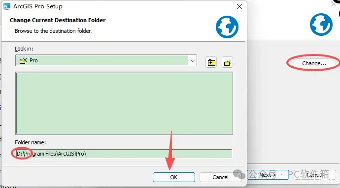 14.修改安装位置:①点击【Change】②修改路径地址中的第一个字符C可更改安装位置(如:把C改为D软件将安装到D盘)③点击【OK】。