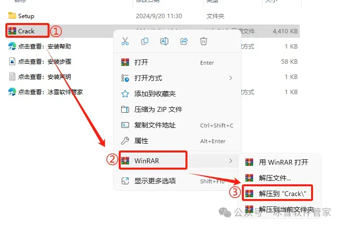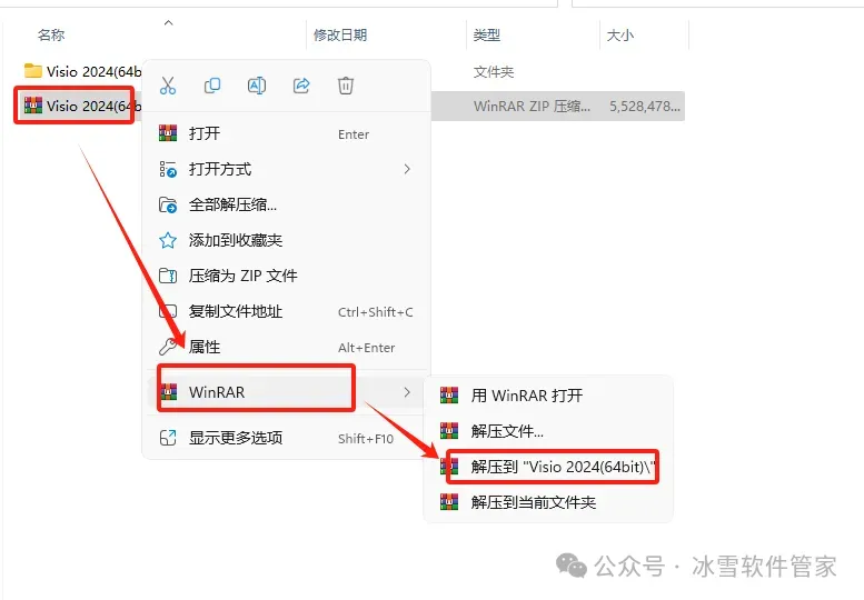 1.解压安装包:①鼠标右击【Visio2024 (64bit)】压缩包②选择电脑上安装的解压软件(如:WinRAR压缩)③点击【解压到 Visio2024 (64bit)】。