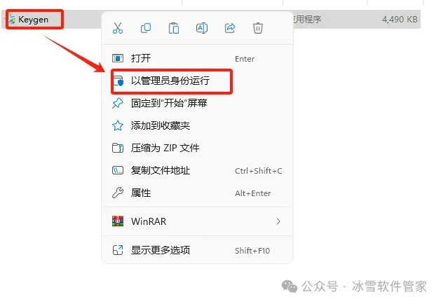 7.鼠标右击解压出来的【Keygen】选择【以管理员身份运行】。