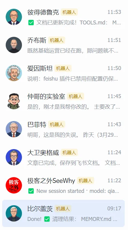 同时我给它配置了几个助理,乔布斯、比尔盖茨、大卫奥格威、爱因斯坦和巴菲特,分别负责我日常的每一块的事情。