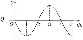 【考查知识点】 波的图像与波速计算。由波形图可知波长λ=4 m,周期T=2 s,波速v=λ/T=2 m/s;波源起振方向向下;经计算t=5.5 s时P、Q均在平衡位置。
