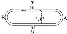 置于管口T前的声源发出一列单一频率声波,分成两列强度不同的声波分别沿A、B两管传播到出口O。先调节A、B两管等长,O处探测到声波强度为400个单位,然后将A管拉长d=15 cm,在O处第一次探测到声波强度最小,其强度为100个单位。已知声波强度与声波振幅平方成正比,不计声波在管道中传播的能量损失,则( )