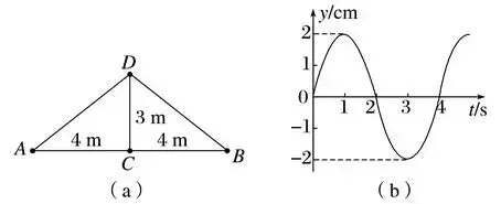 如图(a),在均匀介质中有A、B、C和D四点,其中A、B、C三点位于同一直线上,AC=BC=4 m,DC=3 m,DC垂直AB。t=0时,位于A、B、C处的三个完全相同的横波波源同时开始振动,振动图像均如图(b)所示,振动方向与平面ABD垂直,已知波长为4m。下列说法正确的是( )