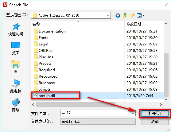 14.在弹出的文件资源管理器中,找到软件安装目录下的amtlib文件,点击“打开”。默认路径为:C:\ProgramFiles\Adobe\Adobe InDesign CC 2015