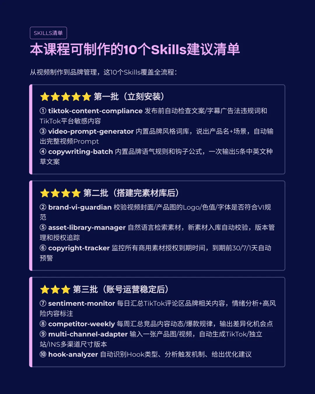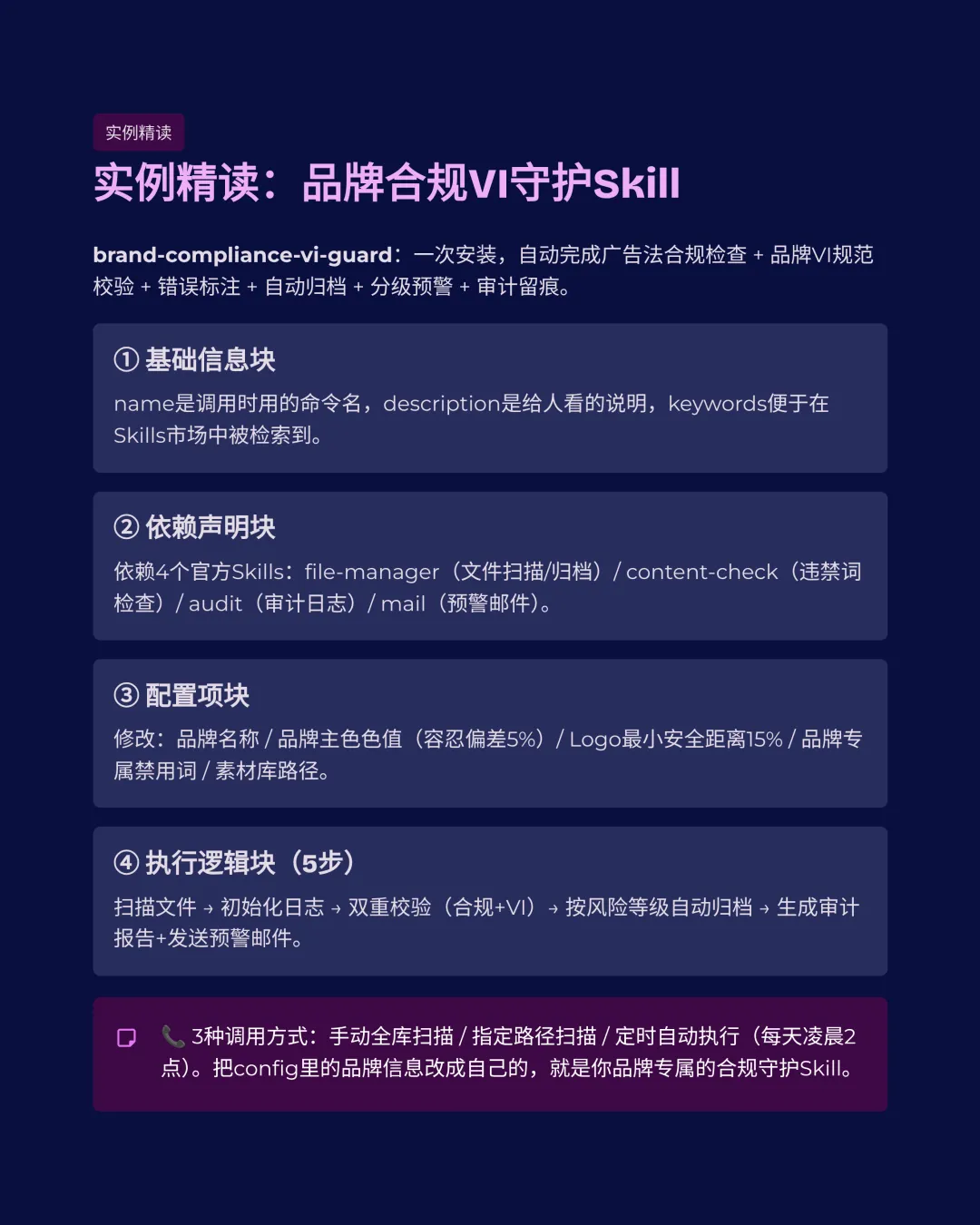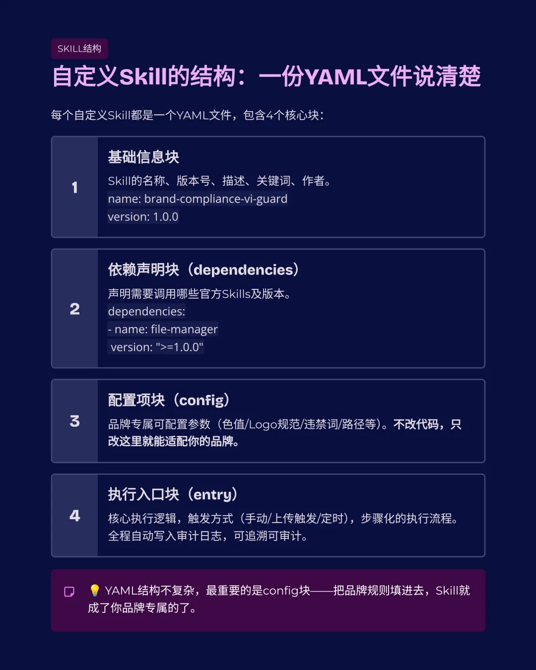 上面 7 大场景讲的还是“用 OpenClaw 做事”。接下来这一部分,是让 OpenClaw 按你品牌的规则做事——这就是自定义 Skills。