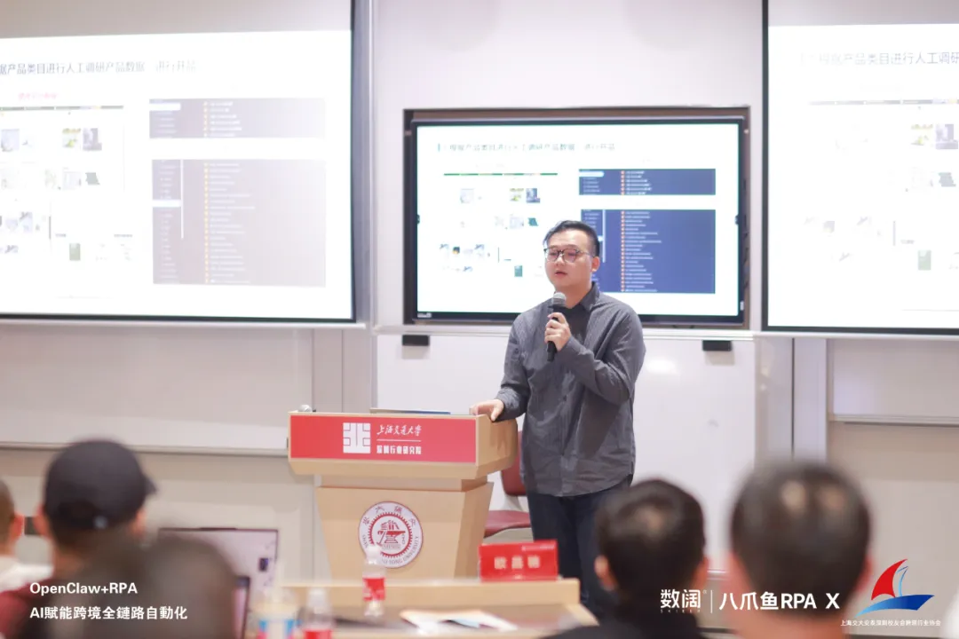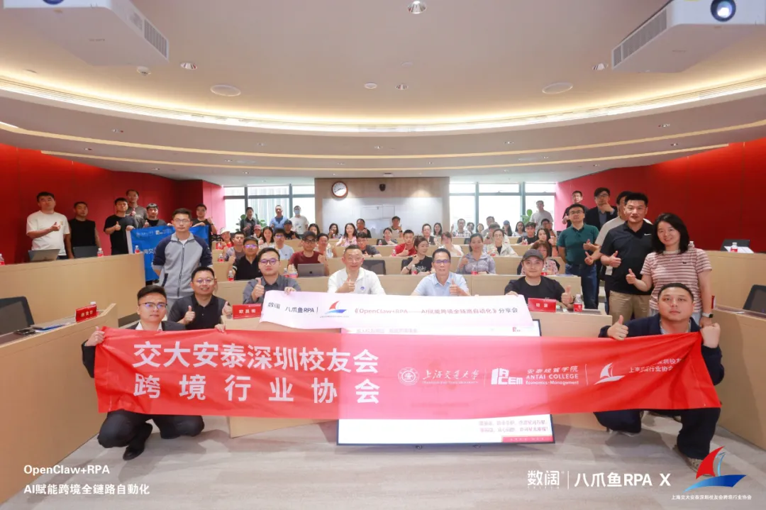 2026年3月28日,由八爪鱼RPA与上海交大安泰深圳校友会跨境行业协会联合主办的“龙虾+RPA,AI赋能跨境全链路自动化”分享会在上海交通大学深圳行业研究院圆满落幕。本次活动汇聚了行业专家、技术大咖与一线跨境大卖,围绕AI时代下跨境电商的自动化转型,展开了深度探讨与实战分享。