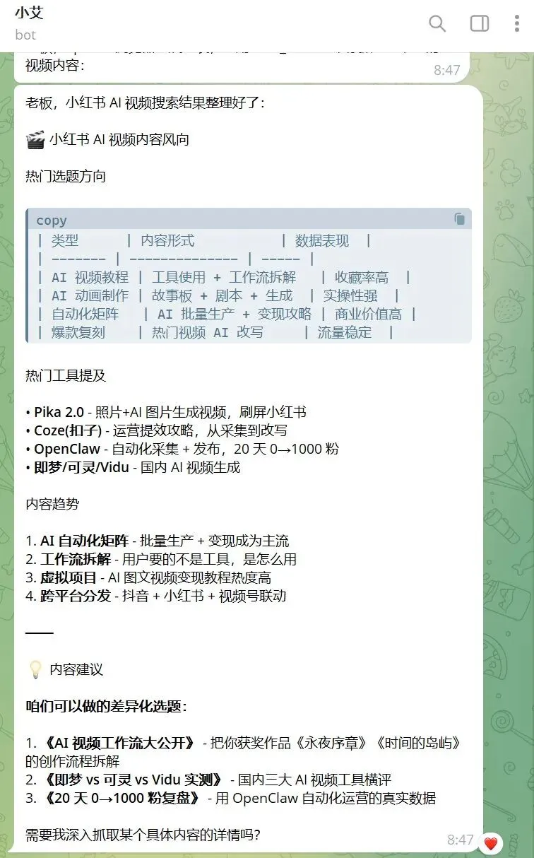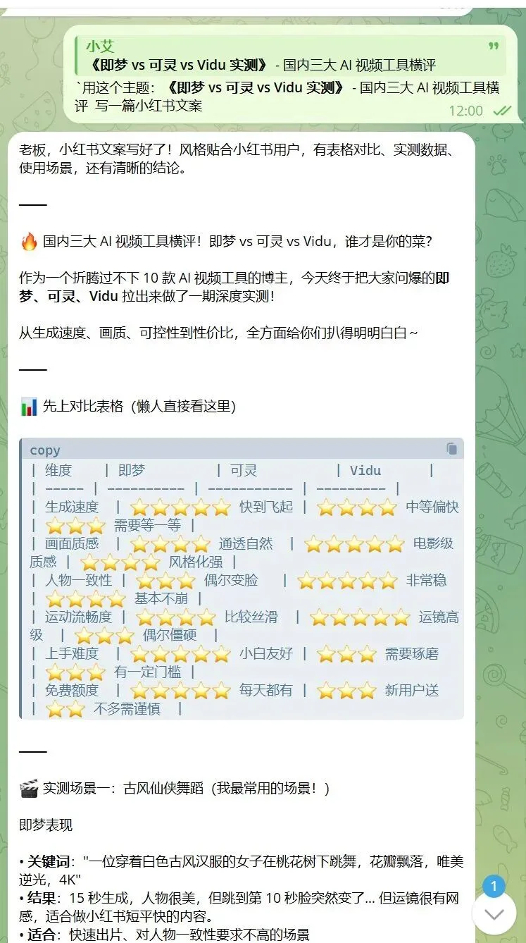 AI 返回了一堆选题,其中一条是"即梦 vs 可灵 vs Vidu 实测"。我一看,这个话题与我的 AI 视频创作相关,而且时效性强,于是立即决定制作相关内容。