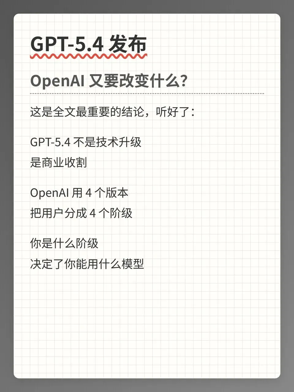 我在制作"GPT-5.4 发布"这个选题时,使用的是"大字报"风格,配图上写着:"GPT-5.4 发布,OpenAI 又要改变什么?