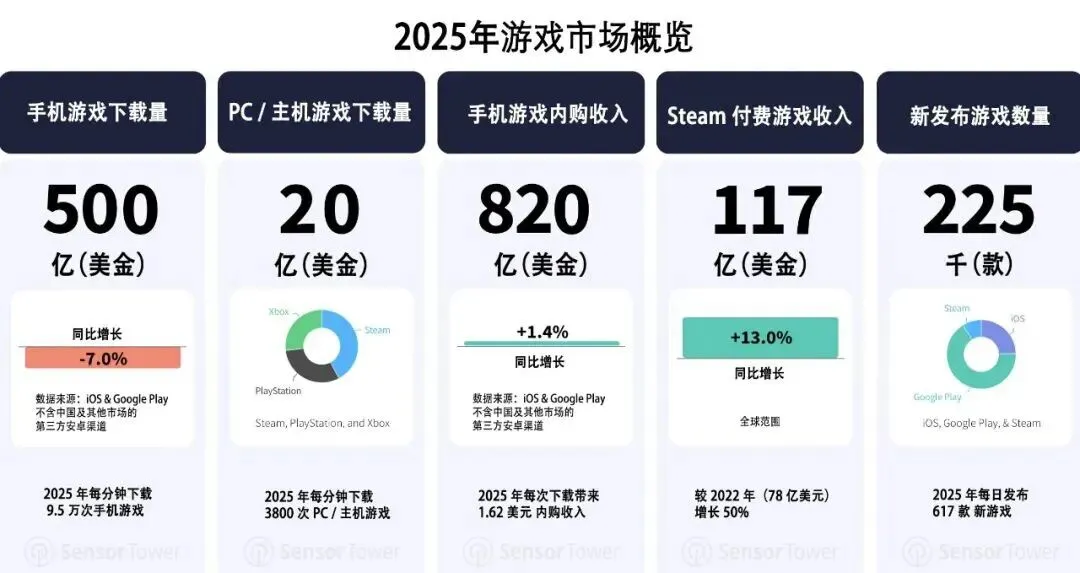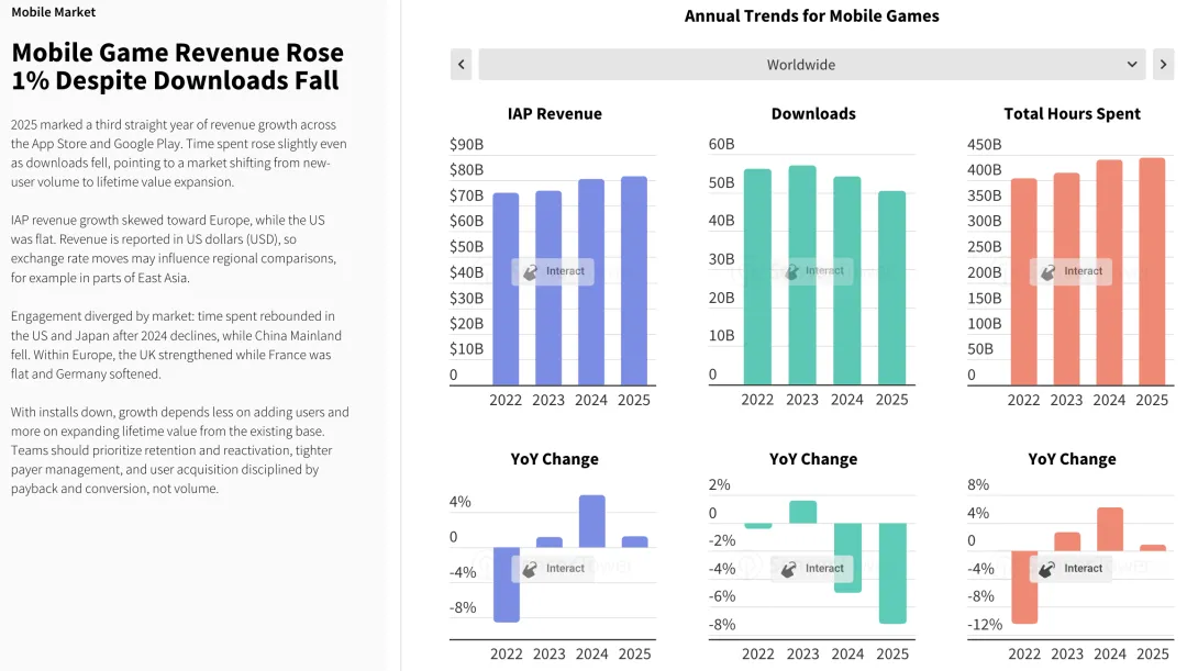 2025年全球手游市场进入“下载下降、收入微增、时长上升”的阶段,增长逻辑正从“拉新”转向“深挖存量用户价值”。