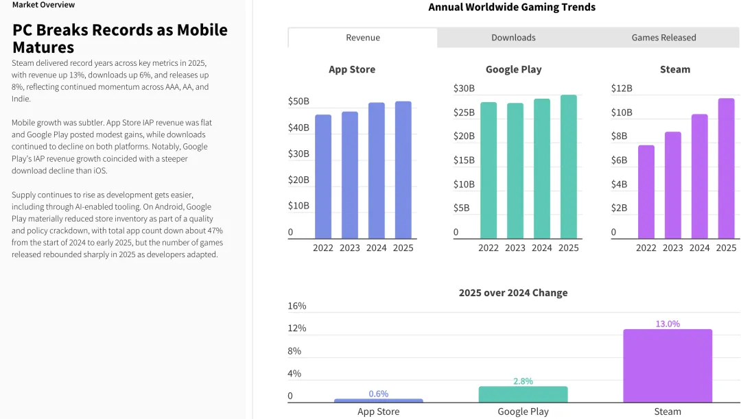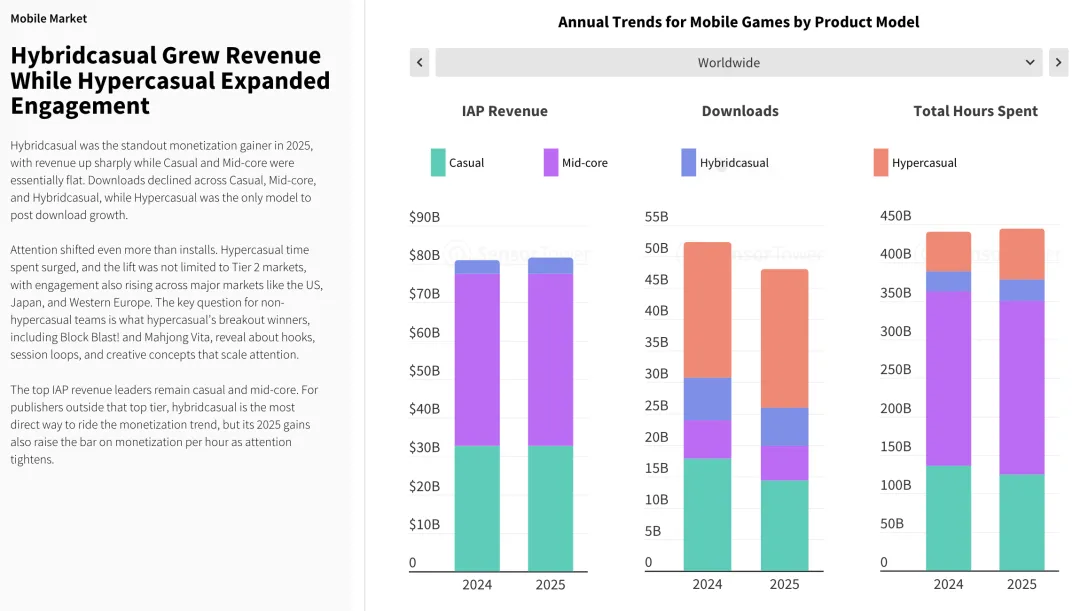 Casual / Mid-core:仍然是 IAP 收入主力,但增长相对平稳,下载承压。