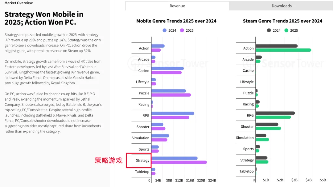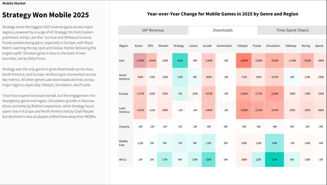 从 2025 年全球移动游戏品类表现来看,策略类成为最突出的增长引擎。它不仅在亚洲、北美、欧洲等核心区域实现了收入增长,还成为唯一一个在这些主要市场中继续推动下载增长的品类。