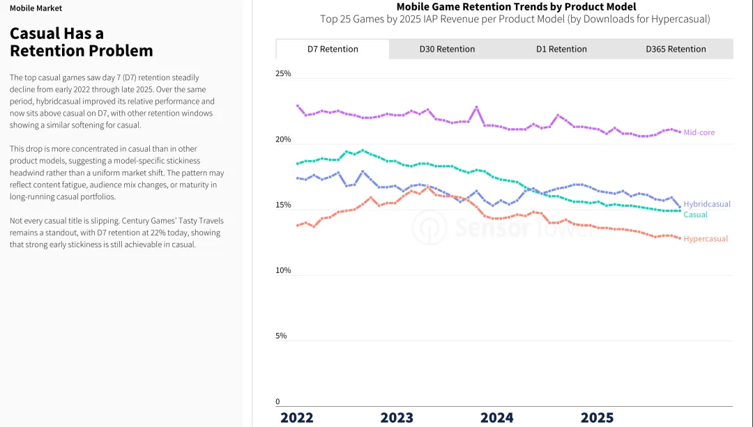 休闲游戏的 D7 留存从 2022 到 2025 持续下滑;