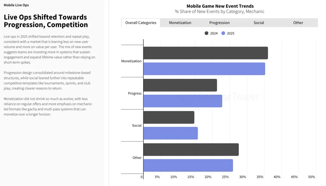 |2025年手游Live Ops的重点,已经从“短期刺激消费”转向“长期留存、成长推进和可重复竞争”。