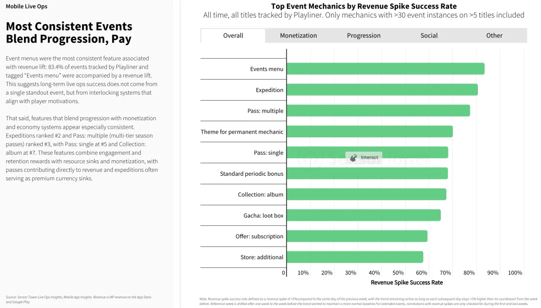 Progression(成长/进度)占比上升最明显,说明厂商更重视里程碑、通行证、阶段目标这类长期驱动;