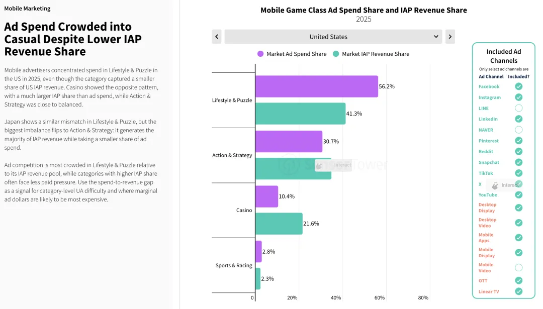Casino 则相反:广告投入占比不高,但 IAP 收入占比明显更高,说明变现效率更强;