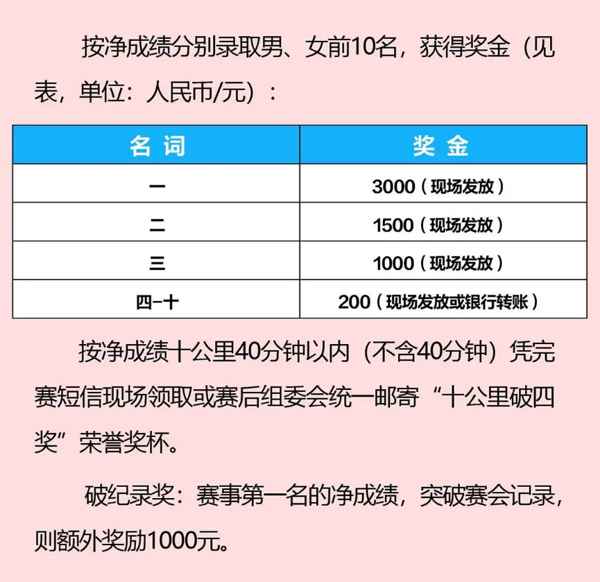 三、第四届十公里精英赛赛事净成绩小于40分钟发放‘十公里破四荣誉牌匾’, 现场已发放, 如未领取者,请联系组委会。