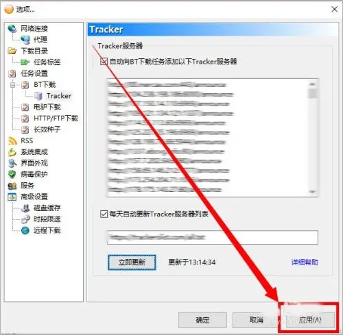 如果觉得速度慢,点界面上方“选项”,在左侧找到“Tracker”,点窗口下方的“立即更新”刷新网速,最后点右下角“应用”就能提速。