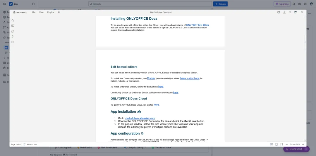 如需了解更多关于此集成方案中格式兼容性的信息,请参阅此 GitHub 页面:https://github.com/ONLYOFFICE/onlyoffice-jira-cloud?tab=readme-ov-file#supported-formats