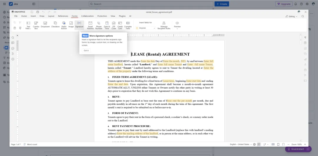 此外,Jira Cloud 用户还可以创建及编辑可填写的 PDF 表单——此类表单包含下拉列表、复选框、文本区域等字段——并可对表单进行数字签名。