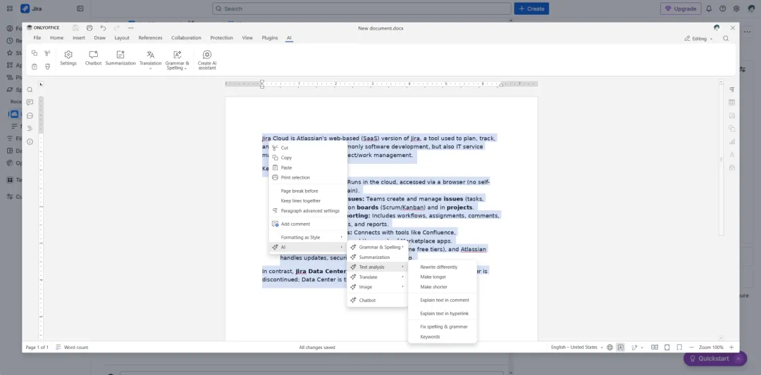 ONLYOFFICE 与 Jira Cloud 集成的另一大优势在于,它兼容主流的 AI 服务提供商及工具,有助于提升工作效率。您可以通过专用插件连接您喜爱的AI 助手,并利用它完成诸多任务: