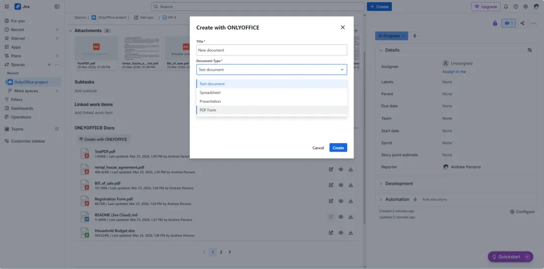 如果您正通过 Jira Cloud 来规划、追踪和管理项目,我们为您带来一个好消息:最新发布的连接器将 ONLYOFFICE 文档的强大功能引入您的云端 Atlassian 平台,让您能够直接在 Jira 界面内创建、编辑并协作处理文档、电子表格、演示文稿及 PDF 文件。欲了解更多详情,欢迎阅读本文。