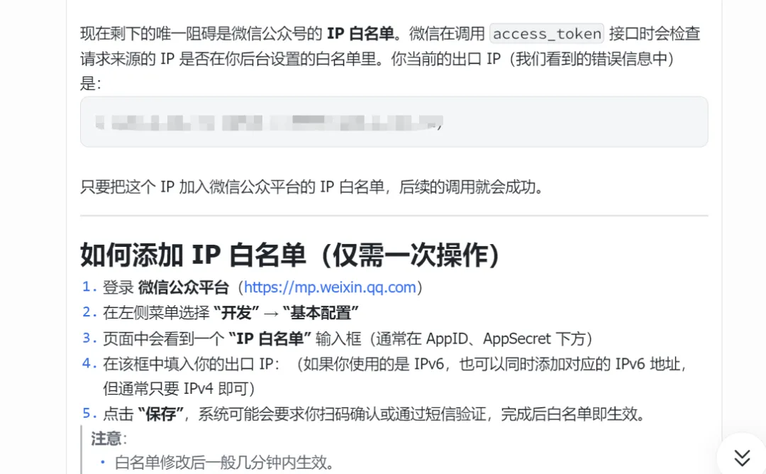 当你将文章主题要求、微信公众号appid和app密钥、文章作者名字发给openclaw后,它会给你访问ip地址让你去添加IP白名单。