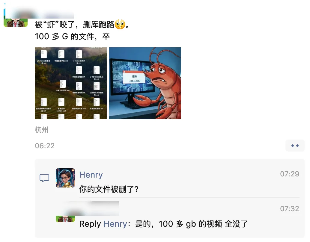 类似的“数据浩劫”并不少见。朋友圈里就有一位被龙虾背刺了,丢失了一百G的视频。