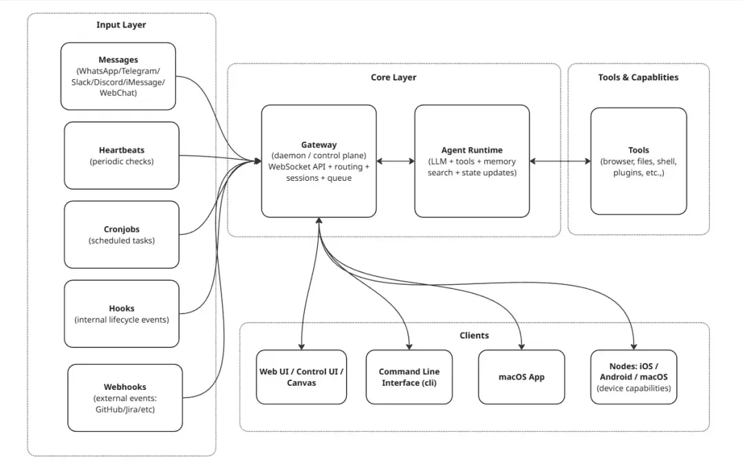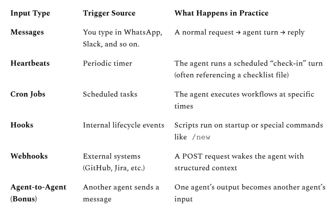 时间 (心跳 + Cron) 事件 (消息 + Hooks + Webhooks) 状态 (会话 + 磁盘上的工作区内存) 循环 (代理回合:读取 → 决策 → 行动 → 写入)