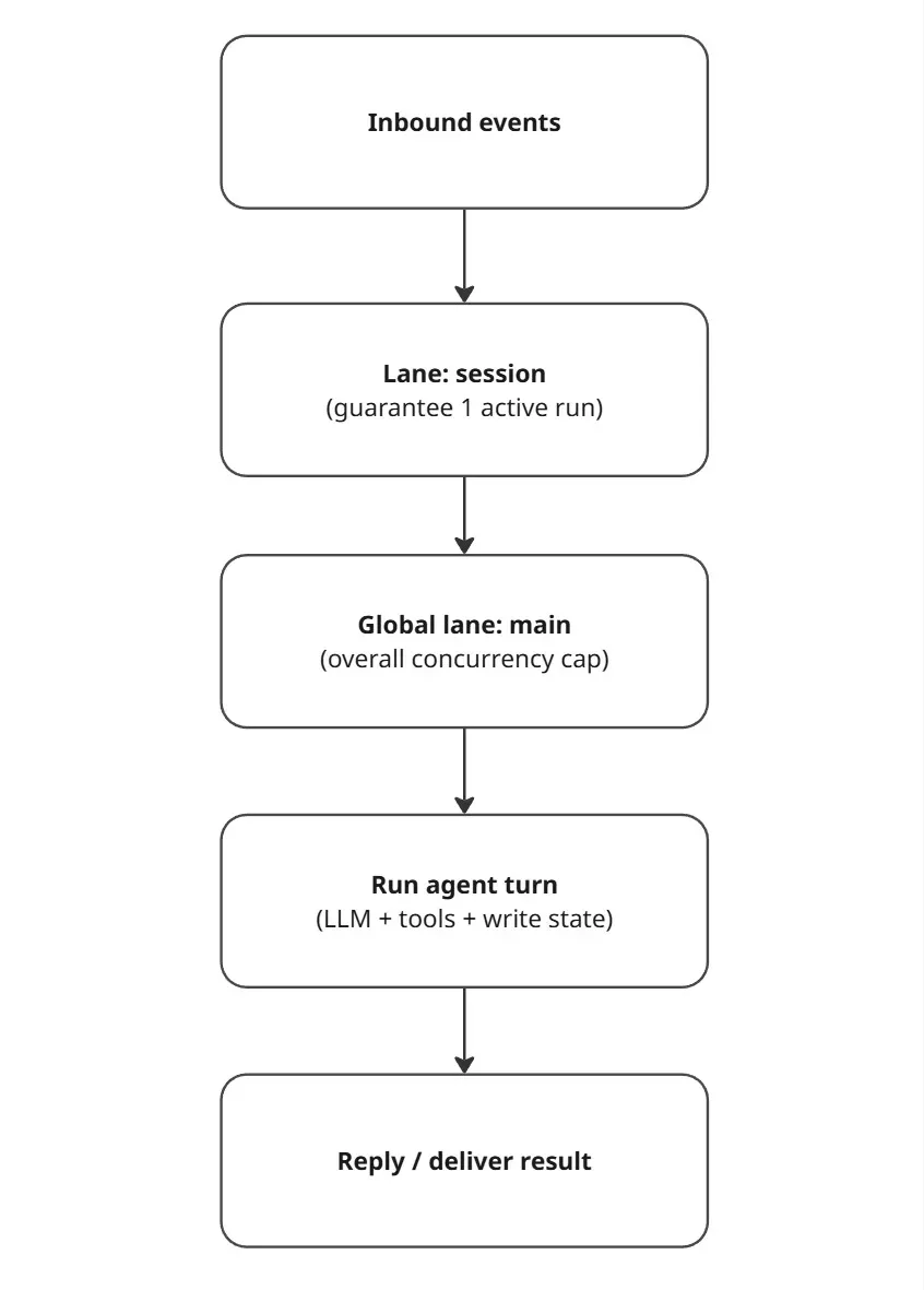 时间创建了一个事件。 网关将其排队。 代理运行了一个回合。 工具执行了操作。