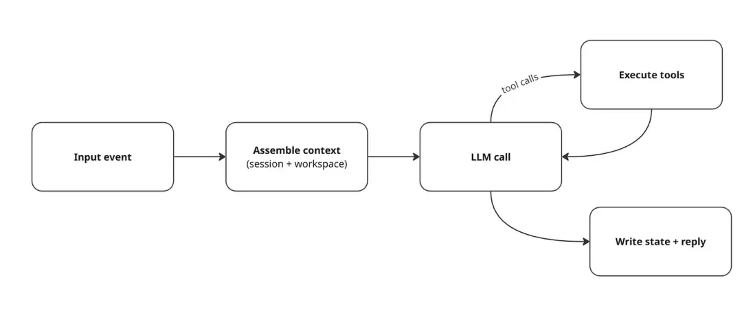 加载上下文(会话历史 + 工作区上下文)。 调用模型。 执行工具调用(浏览器、文件系统、Shell、节点、插件)。 持久化更新。 回复(或故意保持沉默)。