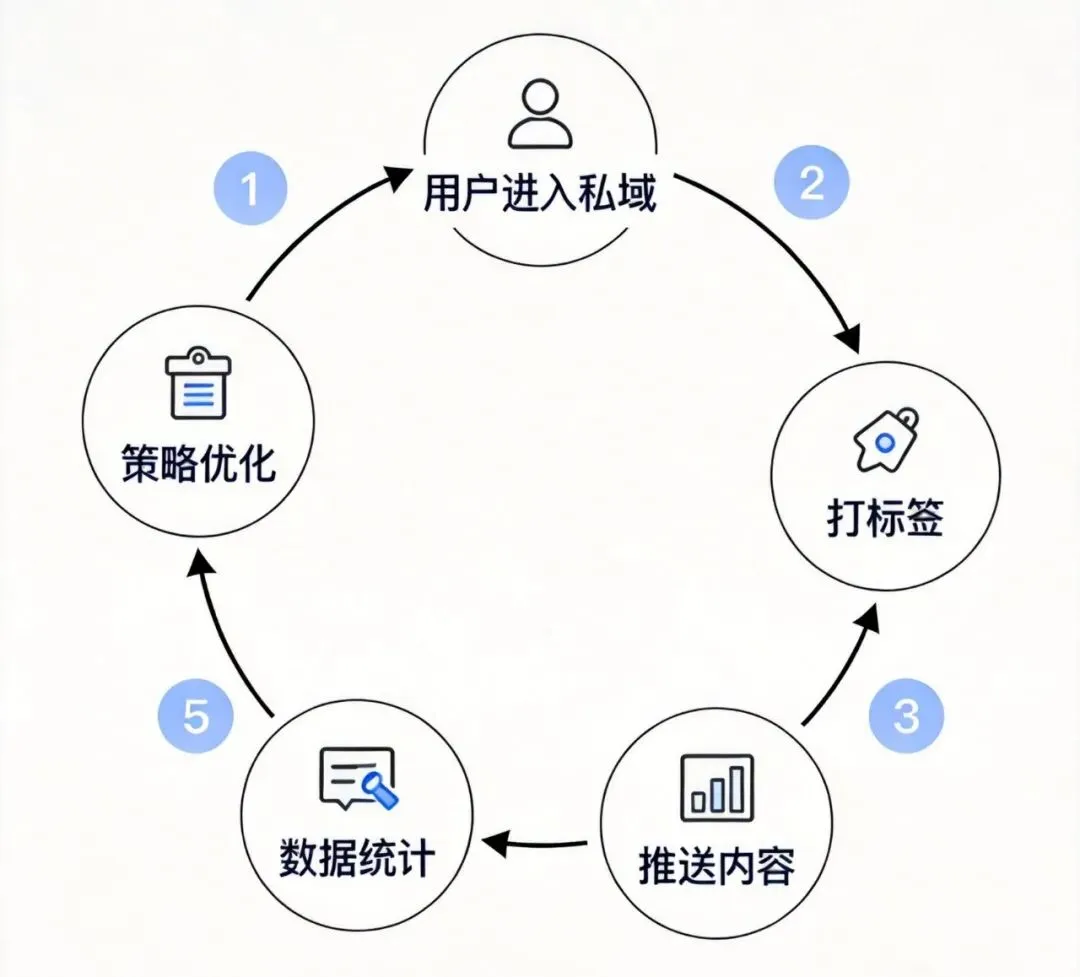用户进入私域 → 自动打标签 根据标签推送内容 → 自动筛选用户,自动匹配内容 用户互动/购买 → 自动记录数据 数据统计和分析 → 自动收集、自动统计、自动生成报告 优化运营策略 → 人工根据数据调整策略 循环优化 → 系统持续优化,策略持续迭代