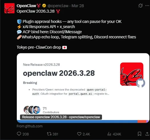 距离上一次大版本才过去没几天,OpenClaw 开发团队就再次火力全开,在 3 月 29 日凌晨正式发布了 v2026.3.28,4天爆更上百项,这只小龙虾的更新速度已经让全球开发者直呼“根本睡不着”。