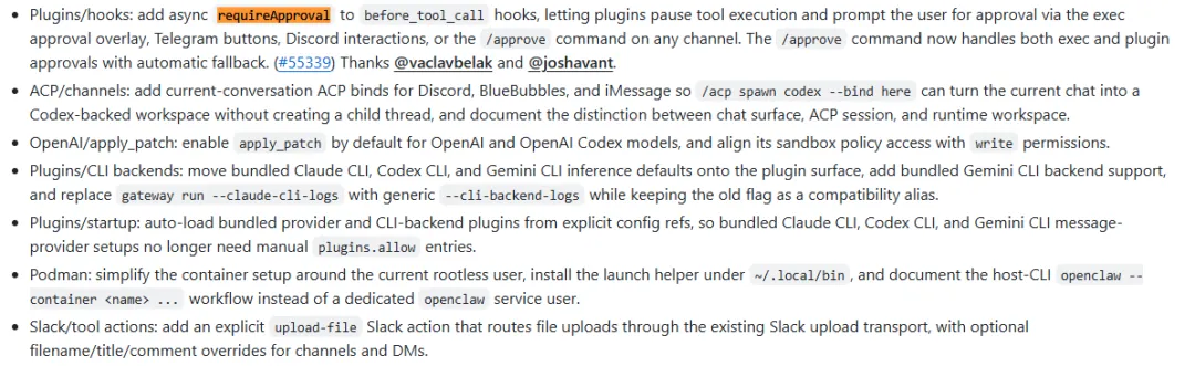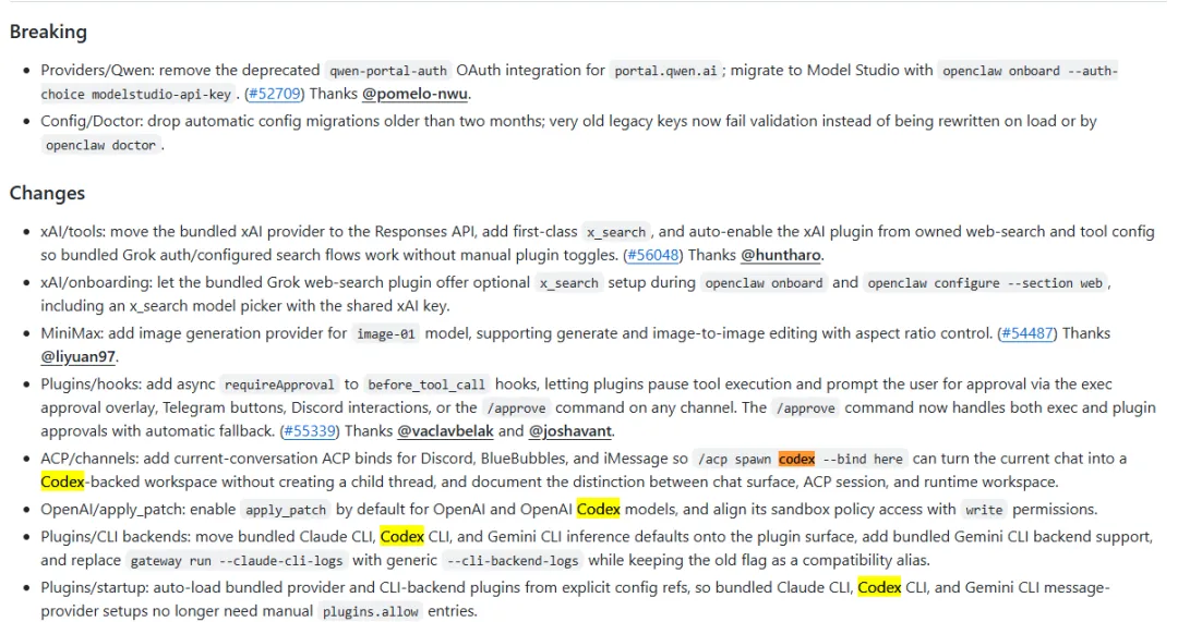Discord、BlueBubbles、iMessage 等渠道新增当前会话绑定能力,子智能体和 Codex 工作空间调用更丝滑。