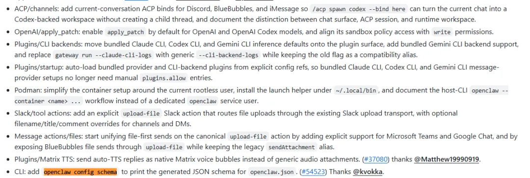 新增 openclaw config schema 命令一键查看完整 JSON Schema;Podman 根less 部署更友好;TUI 界面也优化了端口显示和日志间距,普通用户上手零门槛。