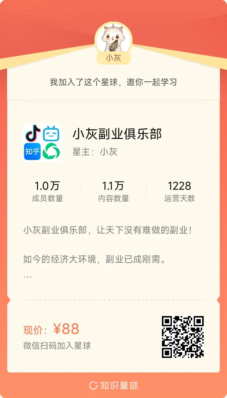 如今小灰副业俱乐部的人数已经突破万人,我们的星球价格也将在4月份上涨,想要低价加入的朋友,请务必抓紧时间扫码: