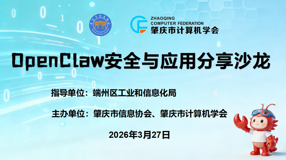 为帮助会员单位全面系统认识大模型、智能体及“小龙虾”等AI领域安全风险,规范AI应用行为,安心“养龙虾”,在端州区工业和信息化局指导下,3月27日,肇庆市信息协会、肇庆市计算机学会联合主办的“OpenClaw安全与应用分享沙龙”在星湖科技举办,活动聚焦大模型、智能体、OpenClaw及AI安全等核心议题,深度交流会员单位实践经验与应用心得。