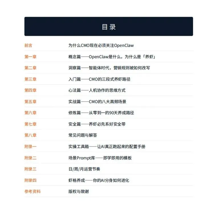 这本手册的目的,不只是教你怎么使用 OpenClaw,更是帮你建立智能体时代的营销思维 ——把 AI 当员工,而非工具。学会与 AI 高效协作,才能在新时代的营销竞争中抢占先机。加入「养虾」阵营,用 OpenClaw 重构你的工作模式,把时间从繁琐的执行中解放出来,重新归还给战略思考与创意打磨,在智能体时代,做营销增长的领跑者!