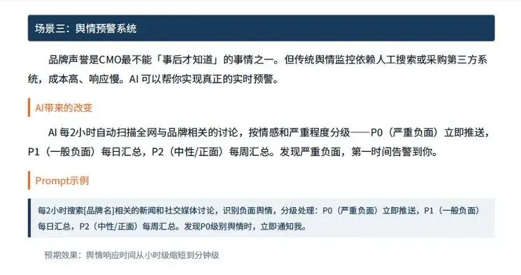 拆解CMO日常工作中最头疼的8大营销场景,每个场景都提供落地步骤+专属Prompt指令模板,复制粘贴就能用,解决AI不会“干活”的问题: