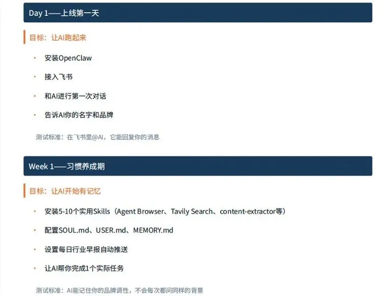 从“让AI跑起来”到“让AI成为专属数字员工”,手册为你规划清晰的90天「龙虾」成长路径,每周、每月都有明确目标+验收标准,不用盲目摸索,每一步都走得踏实,让你的AI从“幼年虾”一步步进化为“能打硬仗的职业虾”。